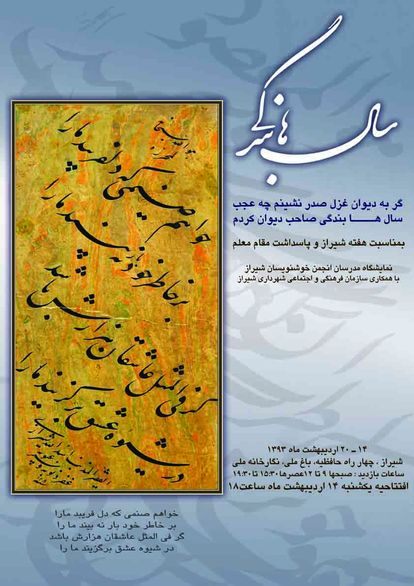 نمایشگاه گروهی مدرسان انجمن خوشنویسان شیراز 14تا 21 اردیبهشت1393 در نگارخانه ملی شیراز برگزار میگردد